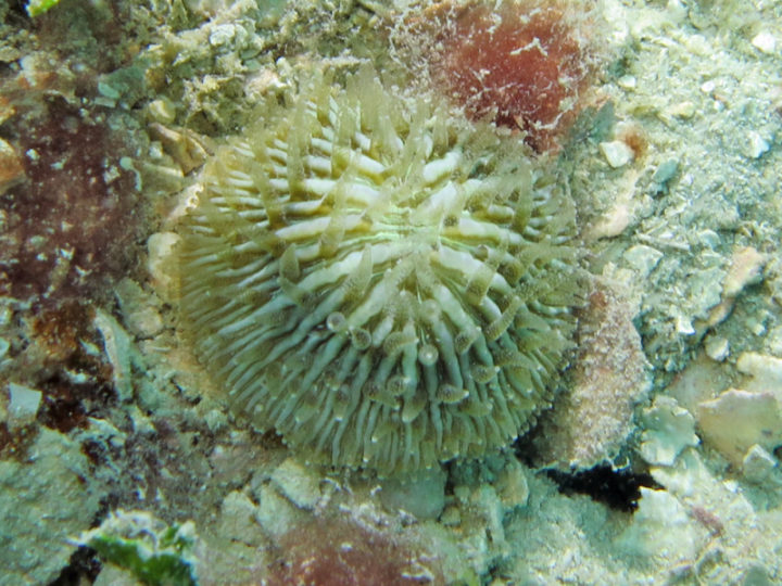 Trata-se coral-cogumelo da espécie Cycloseris cyclolites. O comportamento curioso se diferencia da maioria das mais de 6.000 espécies de corais existentes no mundo.