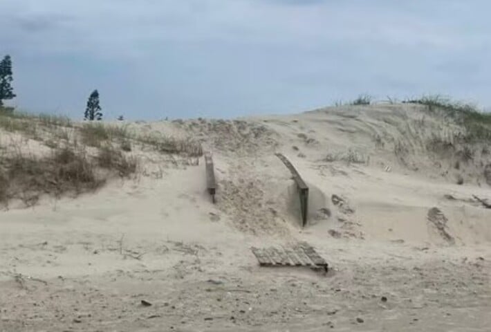 Na praia de Maristela, em Xangri-Lá, veranistas enfrentam dificuldades de acesso devido ao avanço das dunas sobre a passarela que liga a calçada à areia. O problema reflete uma realidade já observada em outras áreas do Litoral Norte, como a Barra de Tramandaí, onde casas e ruas foram tomadas pela areia, exigindo obras de contenção.