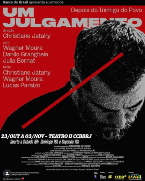 Wagner Moura retorna aos palcos após 16 anos com a peça "Um Julgamento – Depois do Inimigo do Povo". A estreia no Rio aconteceu no Centro Cultural Banco do Brasil, com sessão especial para convidados. O espetáculo já havia sido apresentado em Salvador semanas antes.